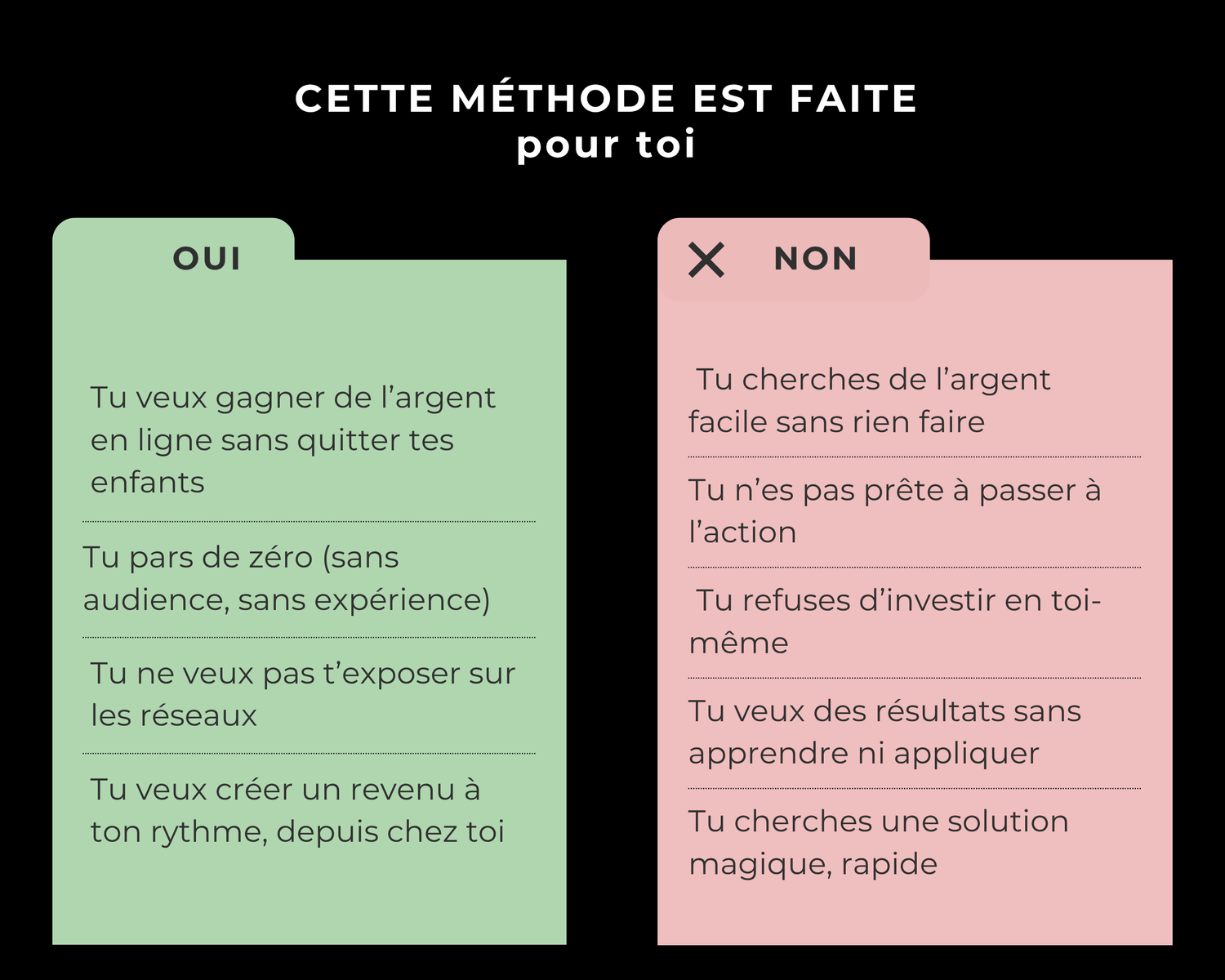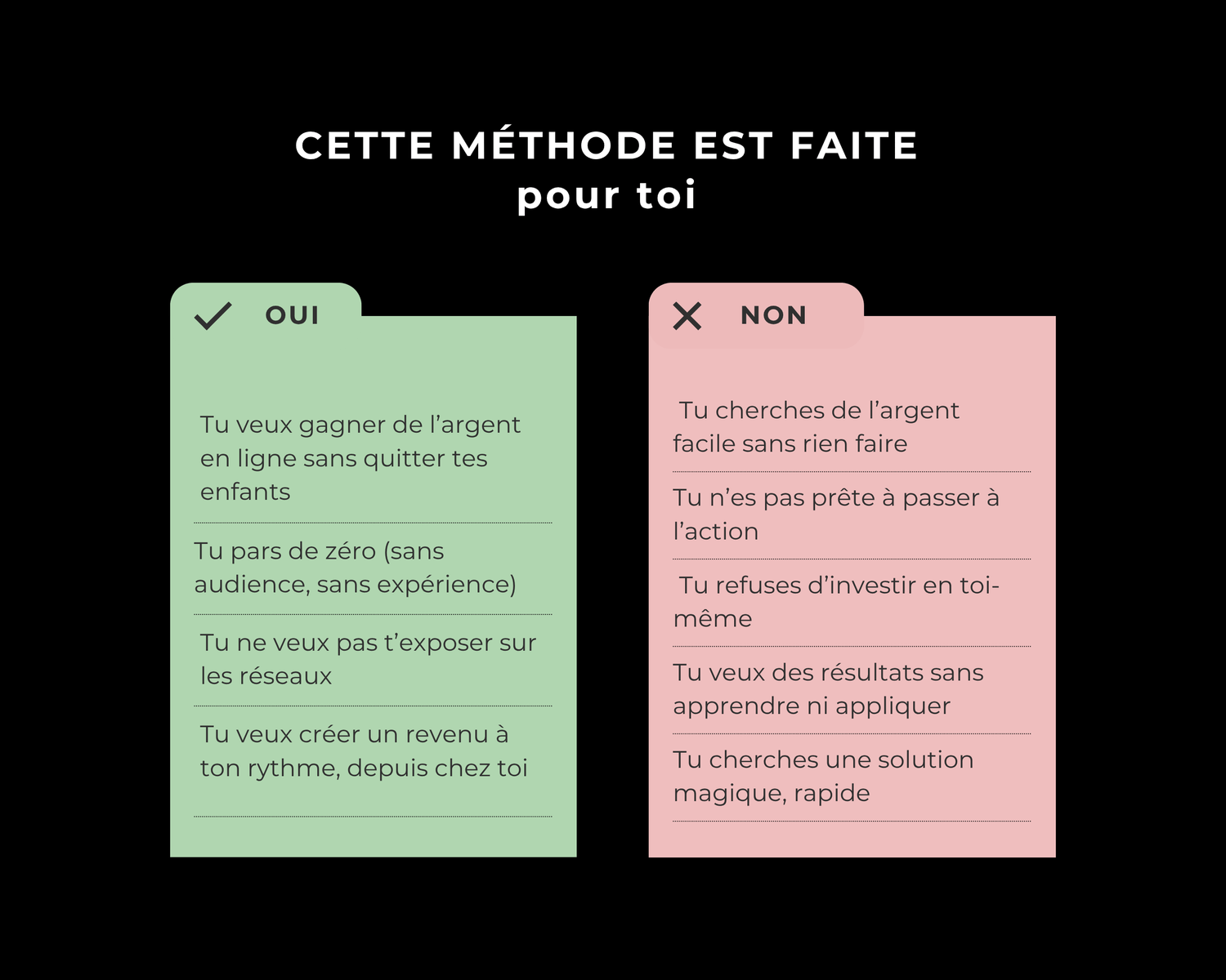 Aujourdâhui, aprĂšs plus dâun an Ă construire ce business, jâai rassemblĂ© tout ce qui fonctionne vraiment dans une mĂ©thode simple, claire et accessible.